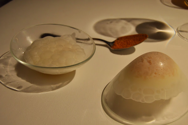 Mousse de crema y txangurro. Te lo servían del revés (como el de la derecha) las burbujas tenían un sabor muy láctico, deliciosas y completamente estables; la base era una carne de txangurro cremosa. La cuchara estaba espolvoreada con una pimienta picante.