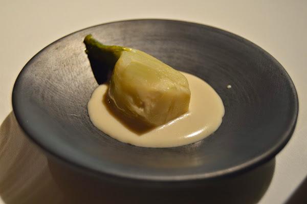 Asado de hinojo y cabra. Un bulbo de hinojo tierno como una cebolla escalivada, con una base de crema de ¿leche? de cabra. Una buena combinación, fresca y grasa, pero en caliente.