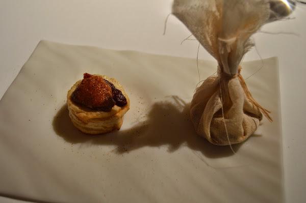 Torrija de yemas. Creo que en algún momento cogí repelús al erizo de mar y desde entonces me cuesta mucho comerlo, problema mío, por eso este plato se me hizo hasta difícil. El saquito estaba relleno de pimientas, para agitarlo el comensal.