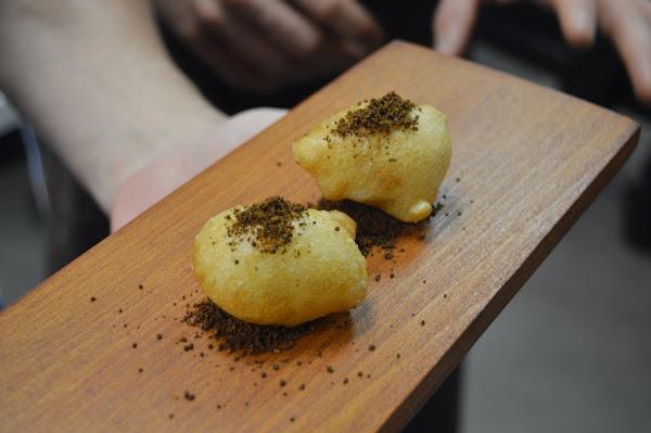 Buñuelos rellenos. Nos los sirvieron en el momento de hacer el tour por la cocina. Nuestra mirada estaba tan "away" que no recordamos de que eran.