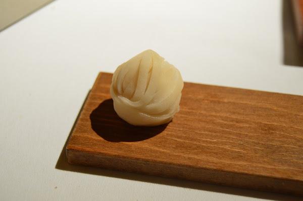 Ovillo de jazmín y heno. Un mochi de diferente forma y un peculiar relleno y sabor a flor.
