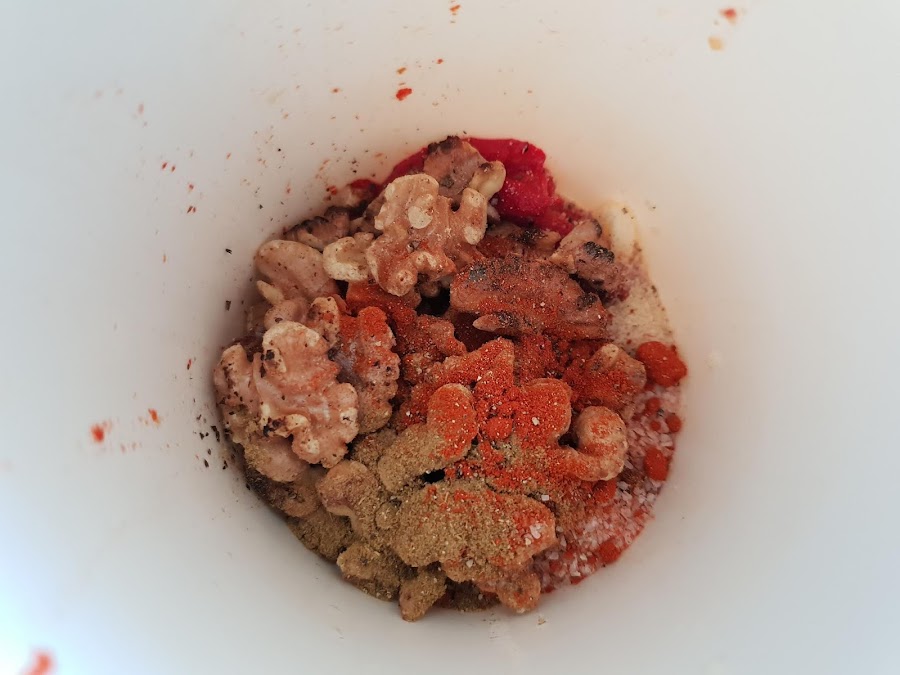 3. - Añadimos el resto de ingredientes: las nueces, el zumo de limón, el ajo troceado, las el comino, el pimentón, la sal , un poco de pimienta y el aceite.