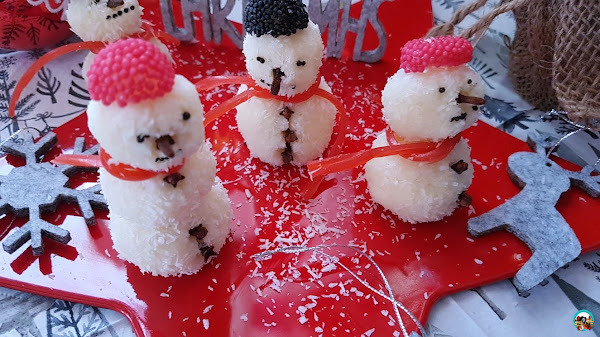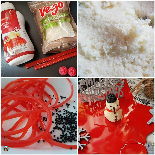 3.- Tomamos porciones de la masa de coco y leche condensada para hacer unas trufas. Hacemos unas trufas de coco pequeñas para la cabeza y unas frutas más grandes para el cuerpo. Formamos los muñecos de nieve. Rebozamos las bolas en unas cucharadas de coco rallado.Atravesamos con un palillo la cabeza y el cuerpo para que se queden sujetos.