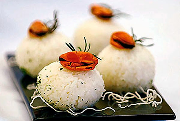 13. Unta con un poco de wasabi cada bolita de arroz, adorna la superfície con una hoja de perejil y un mejillón, presionando ligeramente. Acómpañalos con salsa de soja.