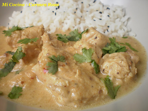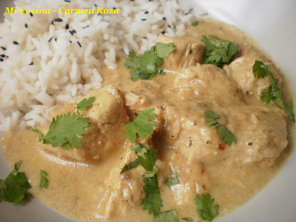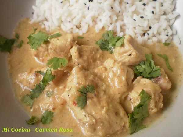 Cuatro pechugas de pollo deshuesadas y troceadas, una cebolla grande (o dos medianas) blanca dulce, una cucharada pequeña de jengibre molido, dos dientes de ajo, dos cucharadas pequeñas de garam masala (se puede comprar en establecimientos especializados orientales, herboristerias e incluso en supermercados), media cucharadita pequeña de café de guindilla picada (si gusta que pique se puede aumentar la cantidad), una cucharada pequeña de sal, una cucharada pequeña de comino molido, una cucharada de café de cardamomo (quitándole la vaina verde, sólo la semilla), una cucharada pequeña de semilla de cilantro, doce almendras molidas, dos yogures blancos (he usado yogur griego), tres vasos de agua, medio vaso de aceite vegetal, una ramita de cilantro verde.