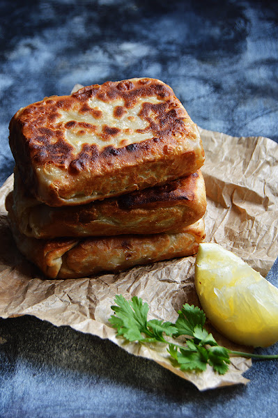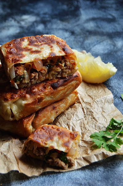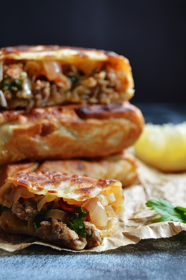 El murtabak es una especie de empanada presente en los puestos callejeros de países como Malasia, Singapur, Indonesia, Yemen... Generalmente están rellenos de carne de cordero aunque éstos que os dejo hoy son de ternera, receta que vi en el blog de La cocina de Aisha.