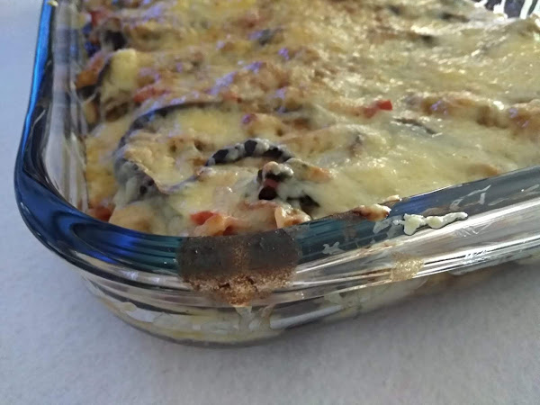 Para montar la musaka: en una bandeja (apta para el horno) comenzaremos poniendo una capa de rodajas de berenjena. Sobre ésta, pondremos una capa generosa de relleno. De nuevo repetiremos con una capa de berenjena y otra de relleno. Finalmente, pondremos una capa abundante de queso rallado y lo pondremos a gratinar durante unos 5 minutos.
