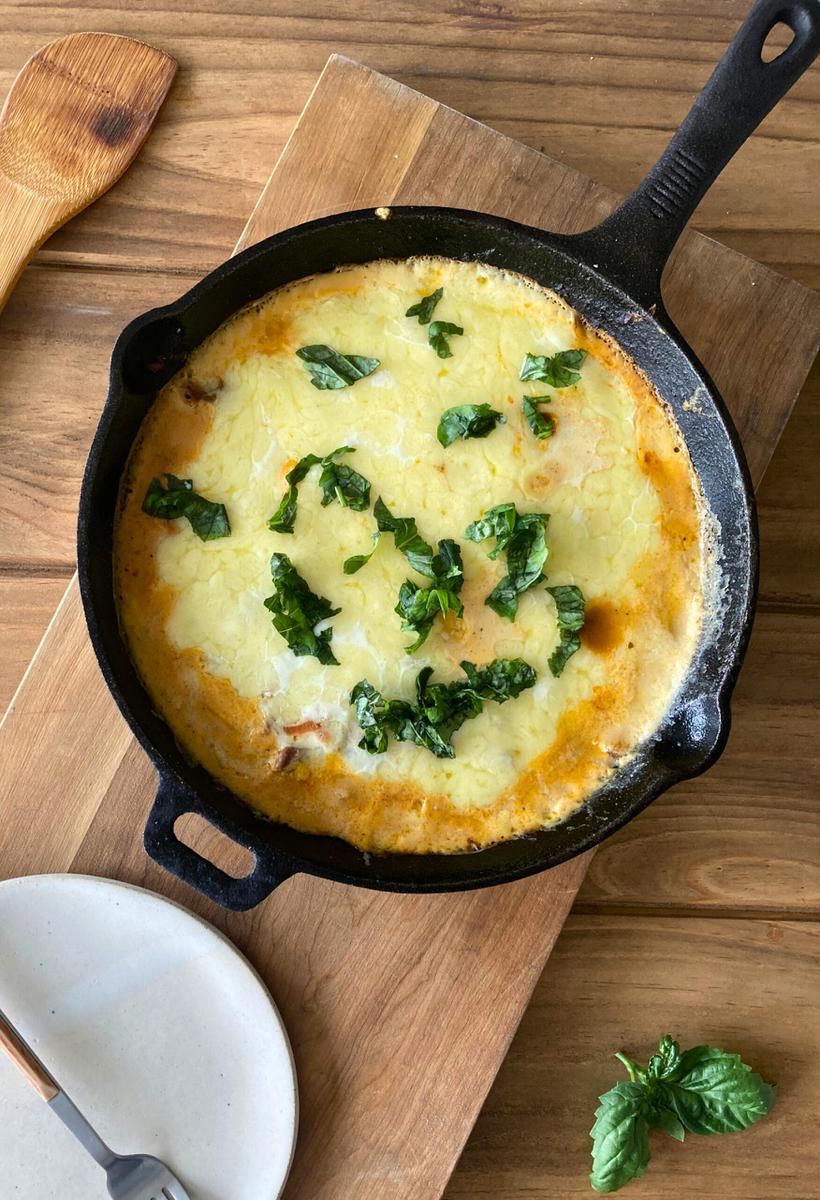 Retiramos, decoramos opcionalmente con albahaca o perejil, y esperamos al menos 10 minutos para que no se desarme al cortar.