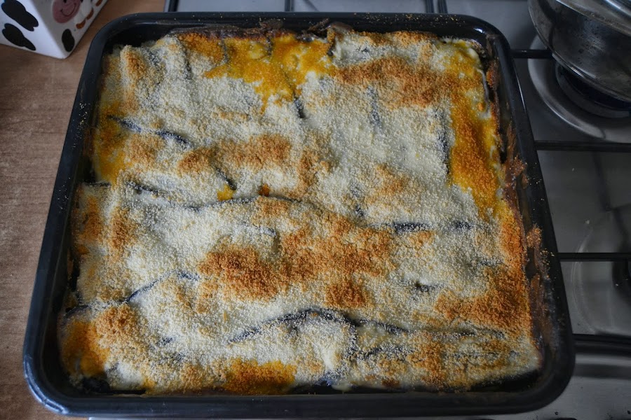 Esta bechamel la vertemos sobre la capa de berenjenas.