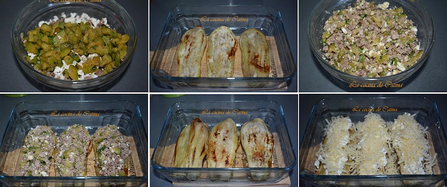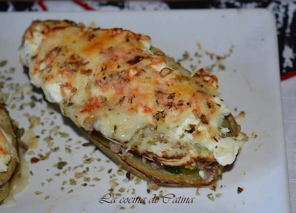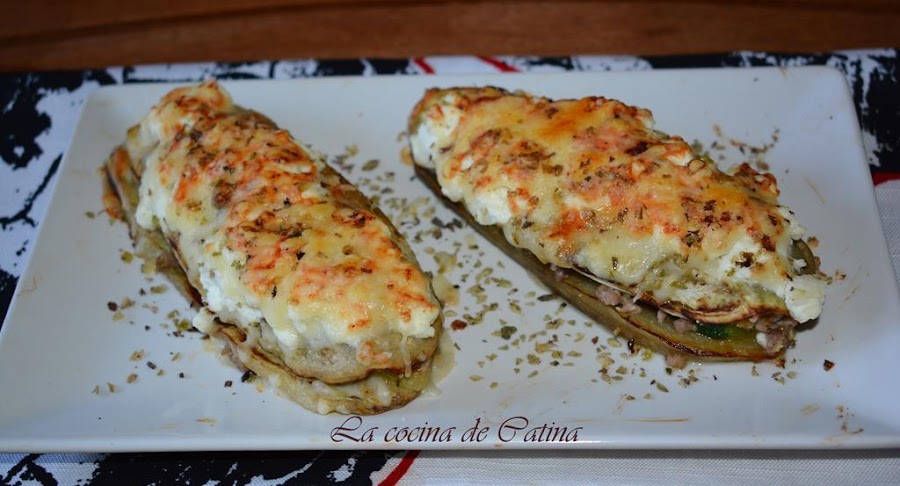 En una fuente para horno colocamos 4 lonchas de berenjena, le ponemos a cada loncha una parte de la mezcla de carne, extendemos bien con las manos para que queden bien cubiertas. Cubrimos con la otra loncha de berenjena, echamos por encima una capa de queso ricota extendiendola como si fuese una bechamel y por último ponemos por encima el queso mozzarella.
