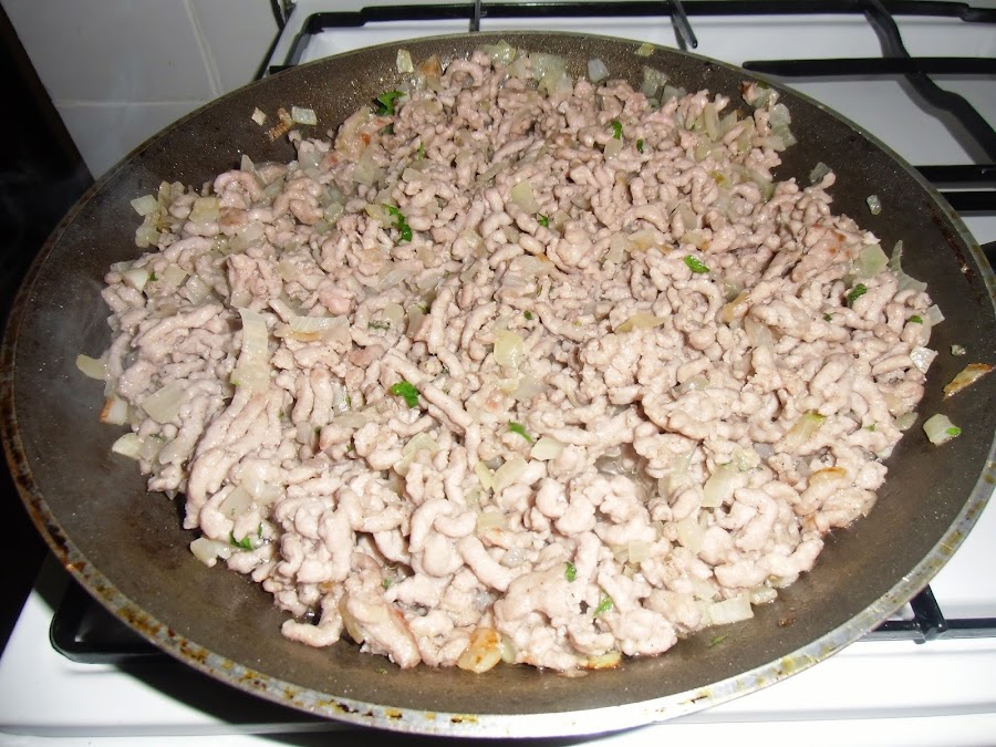 Salpimentamos la carne, la añadimos a la sartén, cocinamos un poco hasta que coja color y echamos un poco de perejil y menta picaditos y luego una pizca de canela molida. Cocinamos unos minutos.