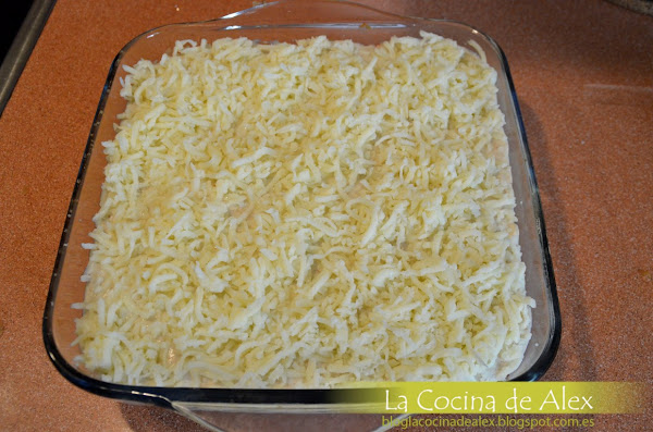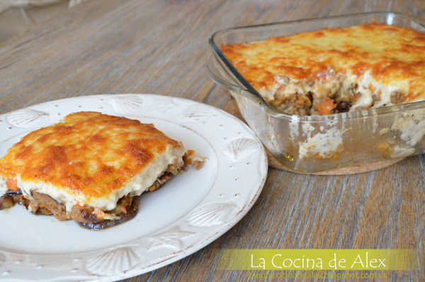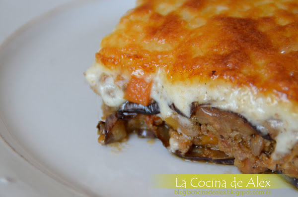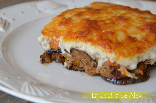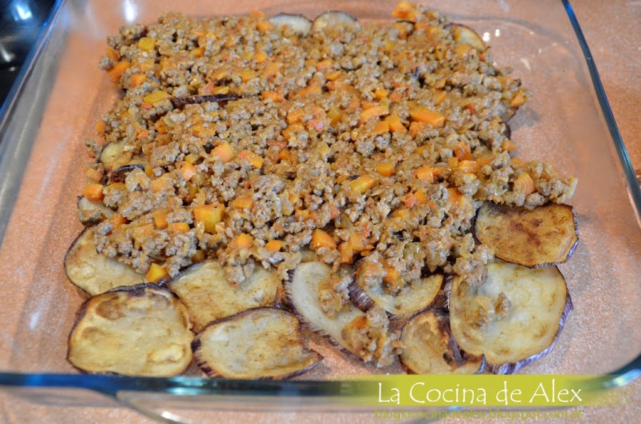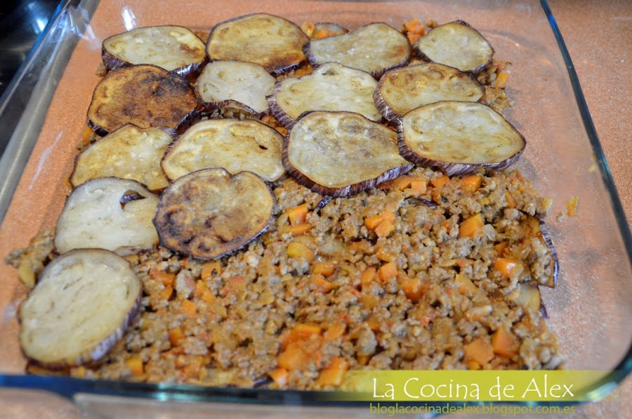 Para terminar nuestro plato solo nos queda el montaje y gratinado, en una fuente ponemos en la base una capa de la berenjena que hemos frito al principio, a continuacion cubrimos con una capa de la mezcla de carne y verduras cubriendo esta otra vez con otra capa de berenjena fritas y así sucesivamente hasta rellenar la fuente y terminando con una capa de berenjenas. Cubrimos con la bechamel y espolvoreamos con el queso rallado por encima, gratinando todo a horno fuerte hasta que este bien dorado durante unos 10min.