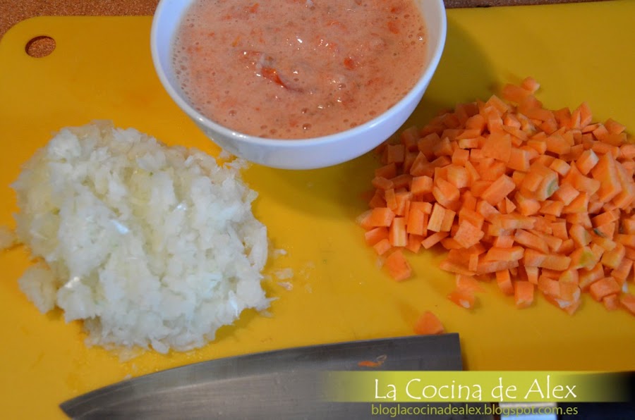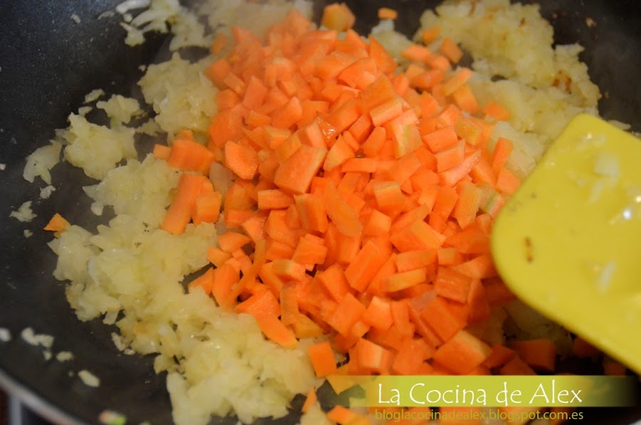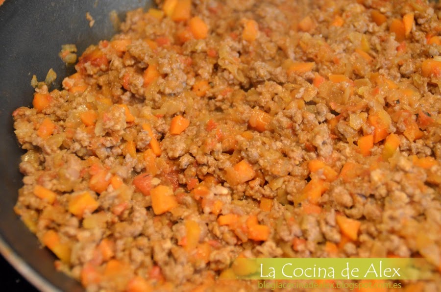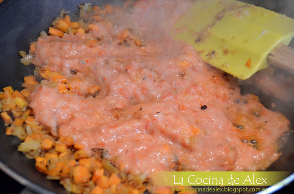 En la misma sarten donde hemos sofrito la carne, sofreímos la cebolla, cuando este pochada añadimos la zanahoria y seguimos sofriendo. Una vez todo bien cocinado añadimos el tomate triturado y reducimos todo hasta que tomate este bien hecho.