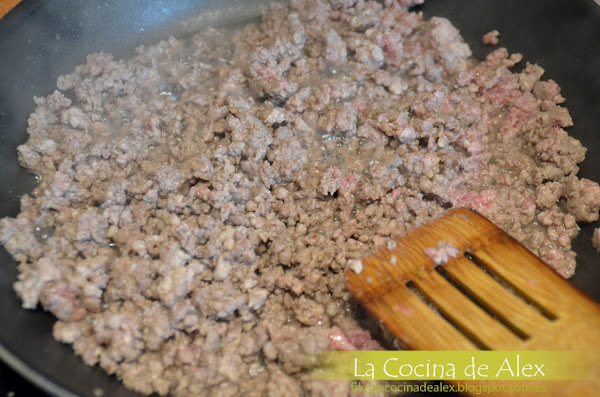 A continuación sofreímos la carne picada en una sarten y la reservamos para añadirla mas adelante. Picamos la verdura y trituramos los tomates.
