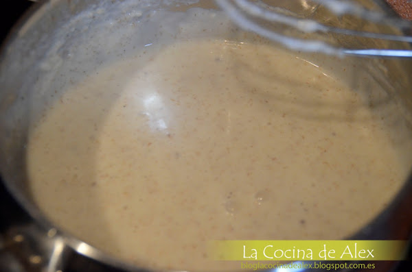 Por ultimo vamos a hacer la bechamel, que al igual que hemos hecho en recetas anteriores (ejem1 o ejem2) seguimos los siguientes pasos: en un cazo ponemos 3 cucharadas de aceite de oliva a calentar junto con las 2 cucharadas de harina, la cocinamos un poco removiendo con unas varillas y vamos añadiendo la leche poco a poco sin parar de remover , al principio la harina absorbe toda la leche pero conforme añadimos mas leche vamos obteniendo la textura de la bechamel que mas os guste, cuando la tengamos hecha añadimos 1/2 cucharadita de nuez moscada, sal y pimienta.