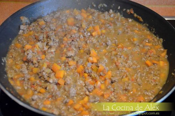 A continuacion añadimos a la verdura la carne picada que habíamos sofrito al principio, junto con el 1/2 vaso de vino blanco y de caldo de pollo reduciendo todo hasta que desaparezca todo el liquido y ya tendríamos listo el relleno de nuestra musaka.