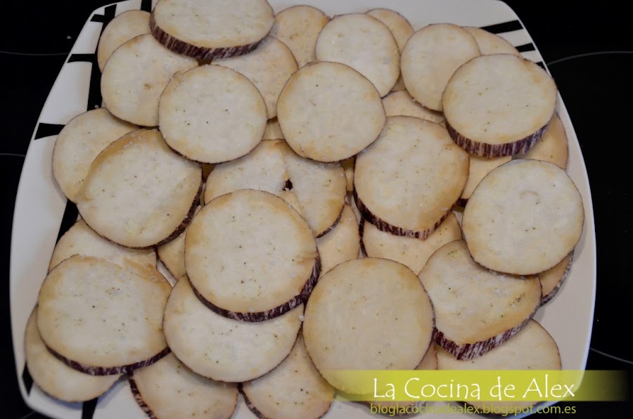 PREPARACIÓN:Lo primero que vamos a hacer es lavar bien las berenjenas, cortarlas en rodajas (no hace falta pelarlas) y las pondremos en una fuente con sal gruesa por encima para que pierdan humedad. Mientras ponemos a calentar una sarten con abundante aceite donde freiremos las rodajas reservándolas sobre una servilleta de papel para que no queden aceitosas.