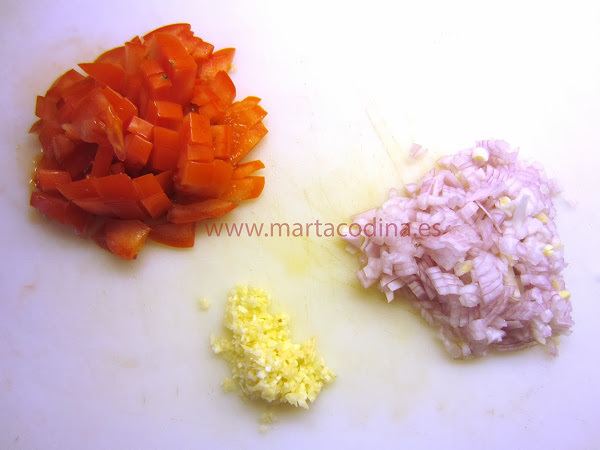 Picar el ajo y cortar a dados la cebolla y el tomate.