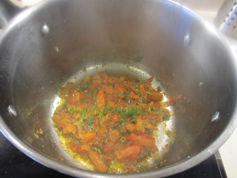 En una olla profunda, poner 4 cucharadas de aceite de oliva y freír un poco el ajo, con cuidado que no se nos queme. Añadir la cebolla, salar y dorar. A continuación, el tomate. Tapamos y dejamos que de evapore el agua del tomate. Cuando esté todo bien caramelizado, echamos el vino. Dejamos que se evapore el alcohol y añadimos el perejil picado y la hoja de laurel.