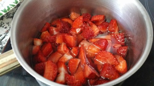 3. Introducir las fresas en el cazo junto al almíbar.