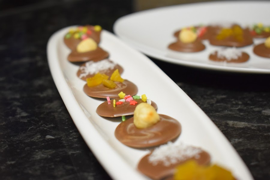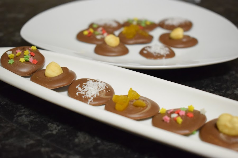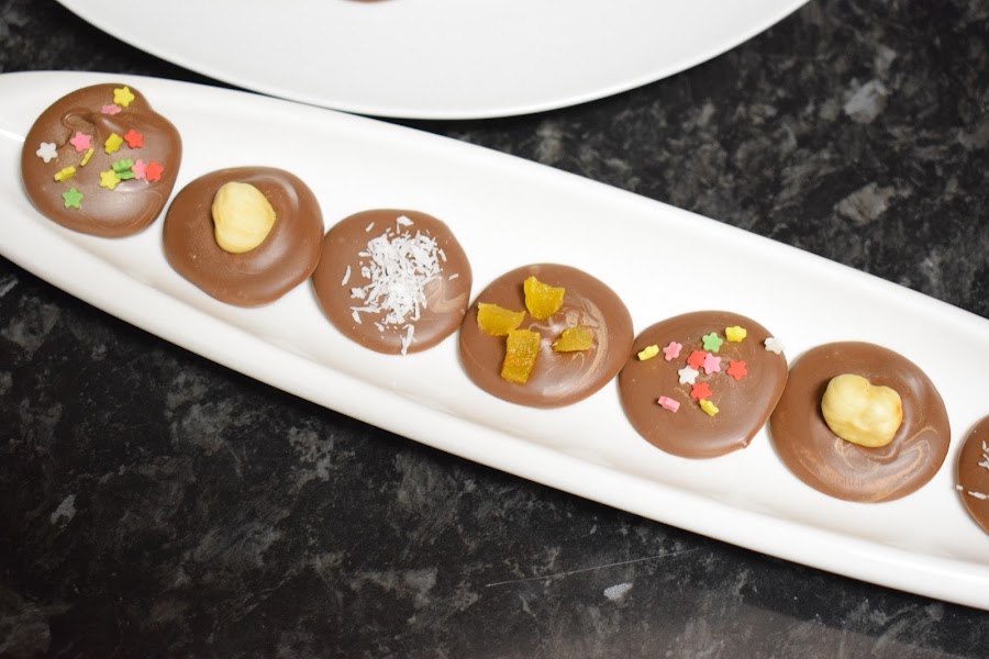 Antes de que se seque el chocolate (muy importante), decorar cada circulo con uno de los ingredientes que hayamos elegido.