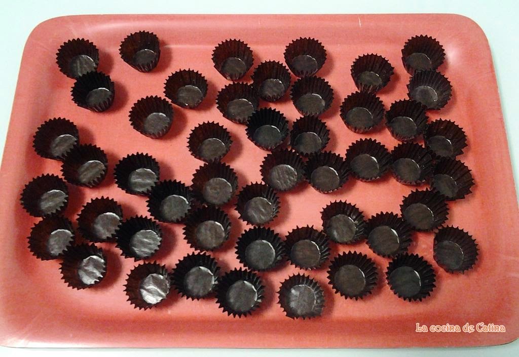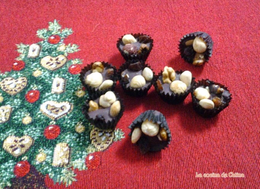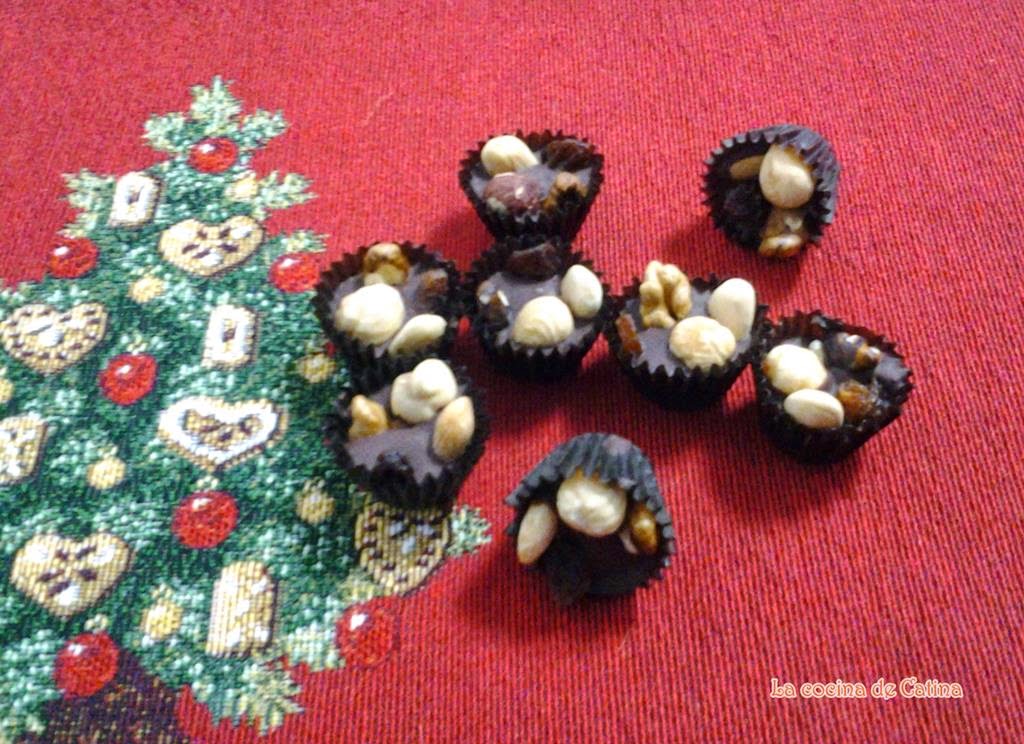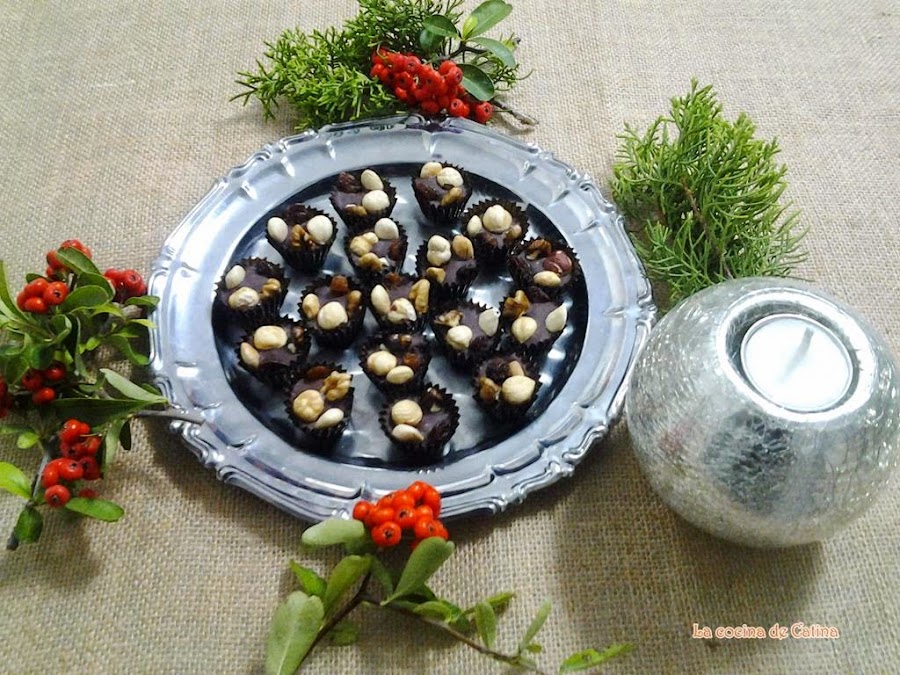 Antes de que el chocolate se cuaje en los canastillos se les clavan los frutos secos por encima, (una almendra entera, una pasa, un trozo de nuez y una avellana fina).