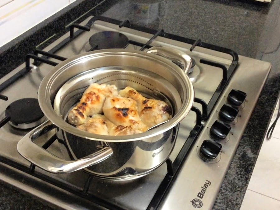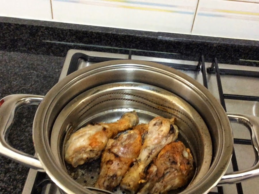 c) Pondremos un poco de sal y pimienta a los muslitos y colocaremos el navigenio en posición invertida sobre la olla.