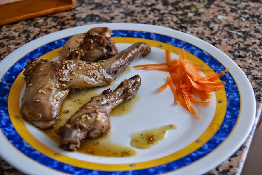 En una plancha con unas gotas de aceite marcamos el conejo para cerrar los poros de la carne y ponemos un poco de sal Maldon por cada lado. En un cazo con aceite colocamos el conejo y añadimos el tomillo. Removemos y tapamos, dejándolo aproximadamente unos 10 minutos hasta que esté hecho. Sacamos el conejo y lo apartamos. Añadimos el agua, la miel y el sésamo y dejamos reducir. Colocamos el conejo en los platos y lo salseamos.