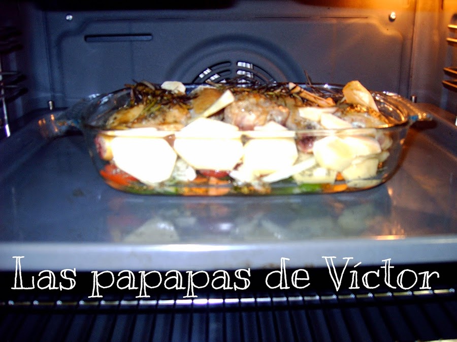 Picar las verduras y en una, bandeja de horno poner un chorrete de aceite y encima las verduras y por último las patatas con pimienta molida y sal