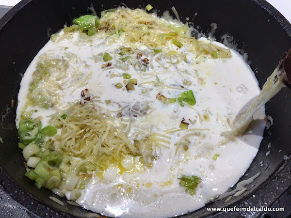 Una vez pochado el puerro añadimos el queso emmental rallado.