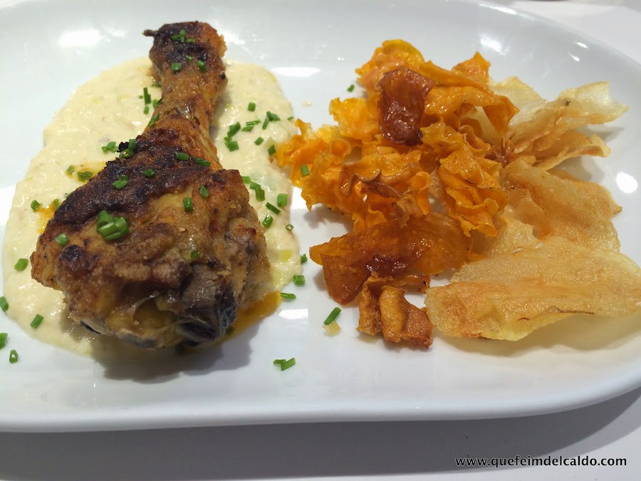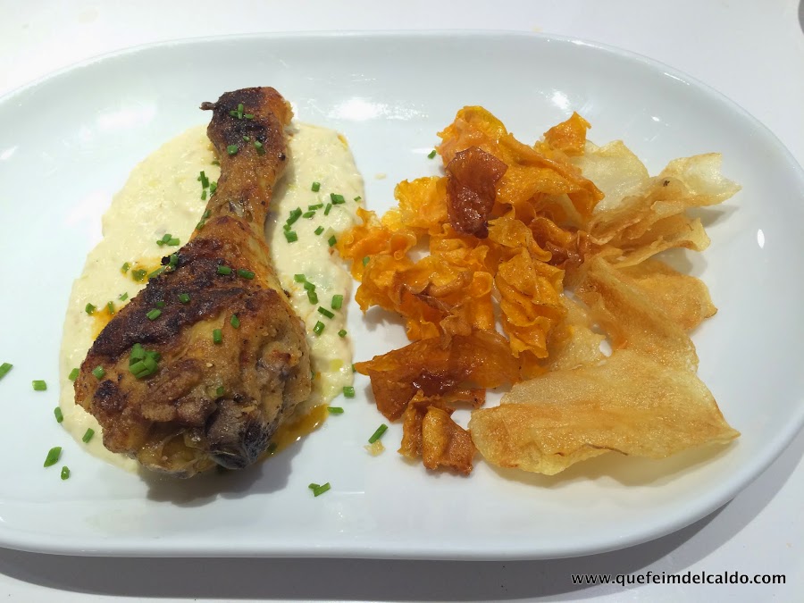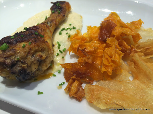 Emplatamos poniendo una basa de salsa de queso, sobre esta base ponemos el muslito de pollo y en un lateral de la fuente las chips de boniato y patata.