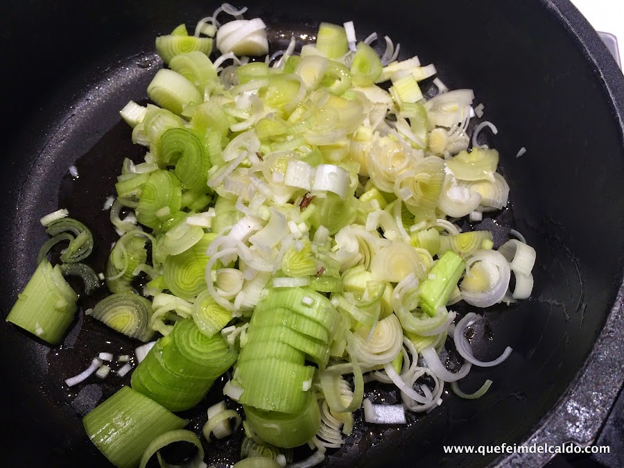 Mientras tanto preparamos la salsa de queso, para ello picamos muy fino el puerro y lo ponemos a pochar con dos cucharadas soperas de aceite de oliva durante 10 minutos, es importante que la potencia del fuego no sea elevada, conviene que esté a media potencia.
