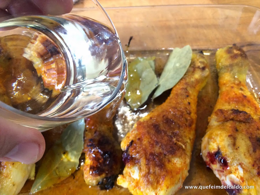 Transcurrido el tiempo de horneado, sacamos y regamos todo con el vino blanco, lo introducimos al horno durante 15 minutos a la misma temperatura.