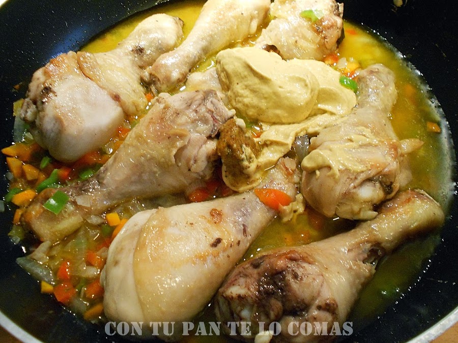 3. Después añadiremos el vino blanco, la pastilla de caldo, el agua y la mostaza. Para mí con dos cucharadas rasas es suficiente.
