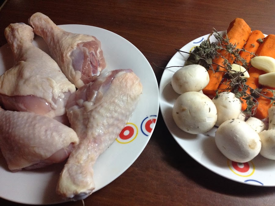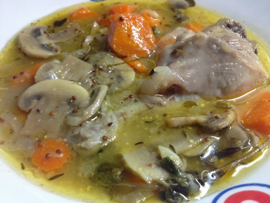 4.- Añade el vino blanco, el tomillo, la cuchara de mostaza, el laurel, un poco de sal, junto con los champiñones y el pollo. Después de unos minutos vertemos un vaso de agua. Tapamos la olla y dejamos que se cocine unos 30 minutos. Después que el pollo este tierno prueba y rectifica de sal.