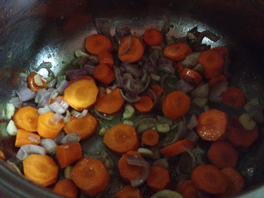 3.- Añade un poco más de aceite y pocha las cebollas, las zanahorias junto con el ajo unos 5 minutos o hasta que la cebolla quede blanda y transparente. Añade un chorro de ginebra y flambea.