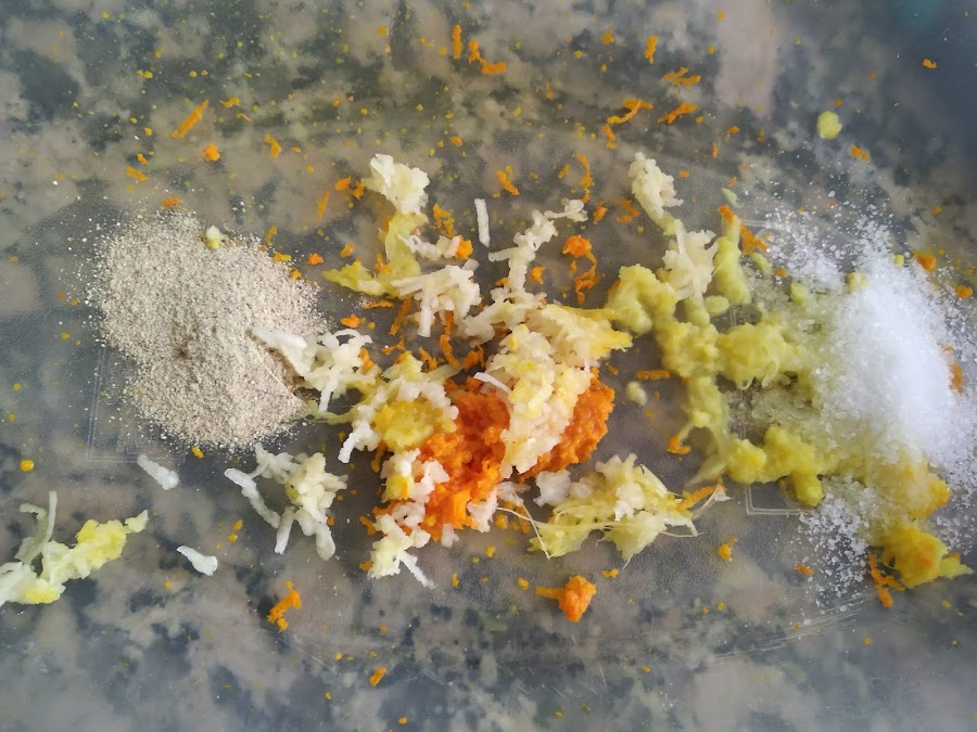 Rallamos también dos dientes de ajo, y hacemos una mezcla con el jengibre rallado, el zumo de naranja, el aceite, la sal, la pimienta, la ralladura de naranja y el ajo rallado.