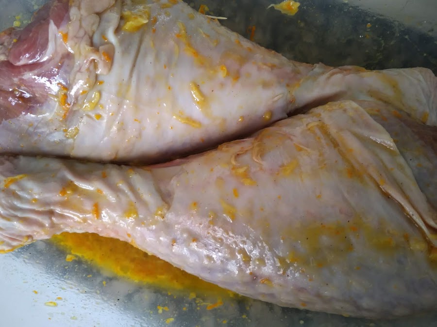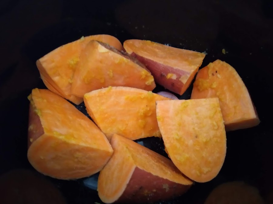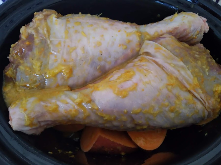 Embadurnamos los muslos con el resto de la mezcla y los colocamos sobre los boniatos. Mi olla es de 3.5 litros, así que tuve que cortar la punta de los muslos para poder meterlos.