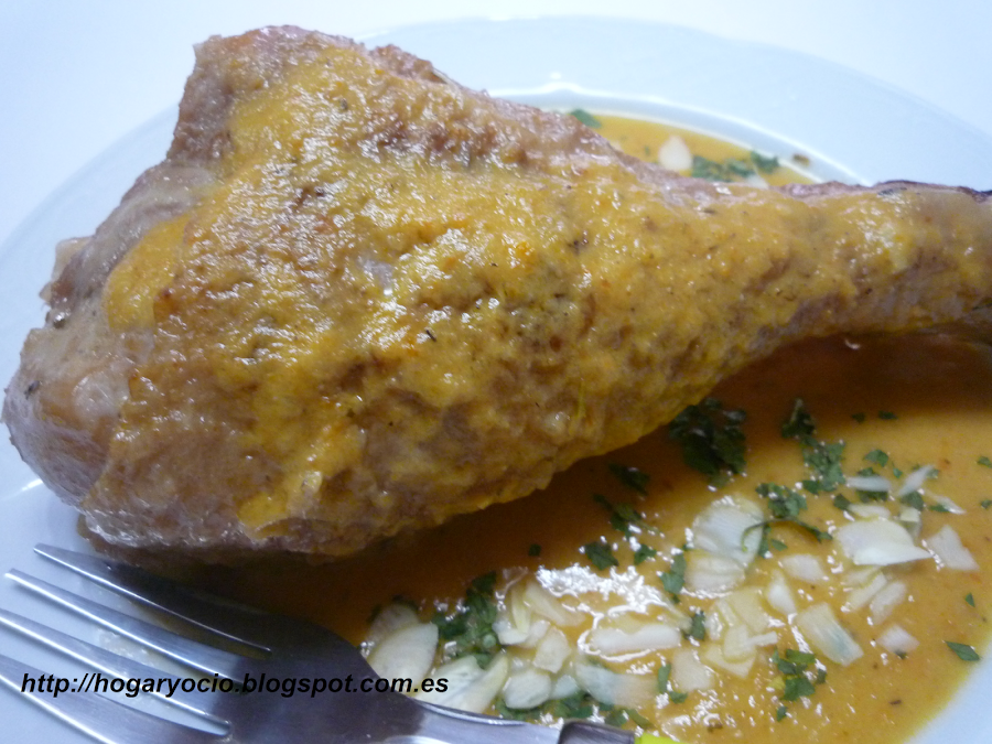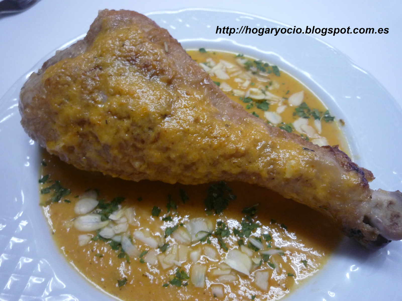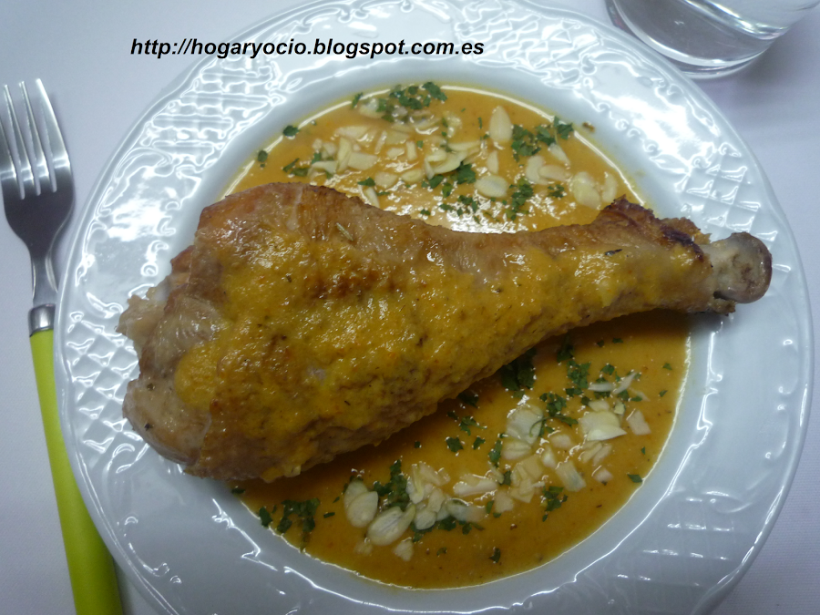 5. Pasamos la salsa por la batidora. Servimos emplatando cada muslo de pavo sobre una base de salsa, y sobre ésta un poco de almendra laminada y perejil seco.