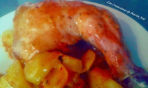 Salpimentar los muslos. En un vaso echar todas las especies con el vino y 2 cucharadas de agua, mezclar todo bien. Meter los muslos en la bolsa de asar junto con las patatas, echar la mezcla, cerrar la bolsa y mover todo para que quede bien mezclado. Meter al horno a 200º 60 minutos.