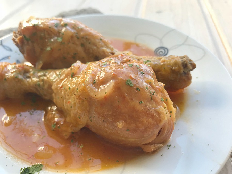 Este segundo mes, la idea era preparar pollo. Este guiso de pollo a la cerveza es el clásico "todo para dentro". Únicamente doro un poquito los muslitos por fuera para que tengan mejor aspecto, ya que, como sabéis, en la olla lenta no toman color, y mis niños protestan un poco porque los adolescentes son de protestar, así, en general. Pero si no tenéis comensales escrupulosos, podéis saltaros el primer paso y, ea, todo para dentro.