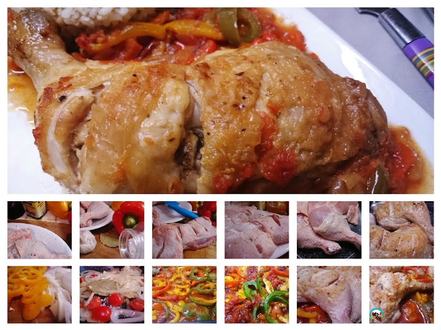 4.- Precalentamos el horno a 180ºC. En una fuente de horno ponemos la salsa de los 3 pimiento, esparcimos sobre ellos el tomate triturado, cocinamos 15 minutos en el horno. Pasado ese tiempo ponemos los muslos de pollo. Cocinamos los muslos 35 o 40 minutos hasta que estén bien dorados por fuera. le damos la vuelta cada 10 minutos para que se cocine bien por todos los lados.