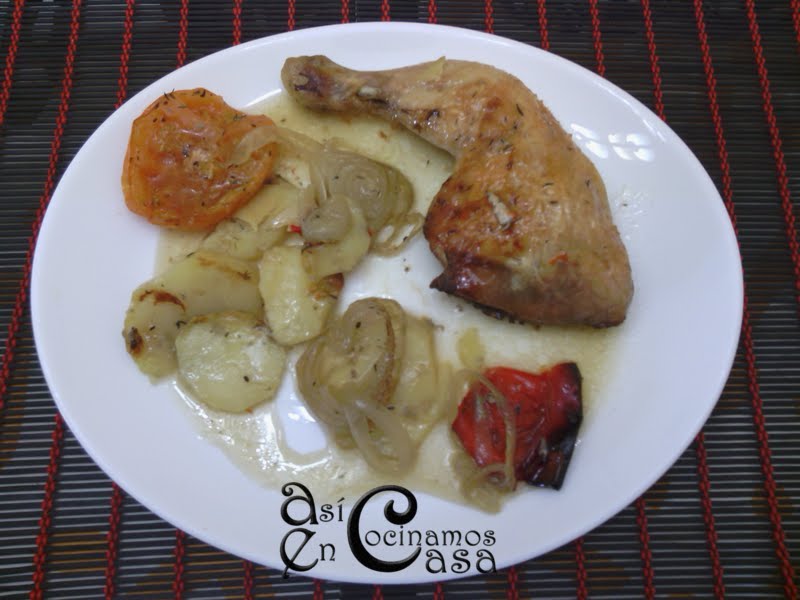 Así mismo me lo comí yo ayer. ¡Estaba buenísimo!Pelamos las patatas y hacemos rodajas. Pelamos también la cebolla, partimos los tomates en 2 y esparcimos por toda la placa del horno haciendo una "cama". Si queremos también le podemos poner otras verduras podemos hacerlo sin problemas, más bueno estará.Limpiamos bien los muslos, en casa muchas veces lo hacemos con cuartos enteros. También se podría hacer con un pollo entero troceado. Salamos y los ponemos encima de la cama hecha con las patatas y especiamos al gusto. A mi me gusta ponerle un poco de ajo deshidratado en polvo y perejil, pero se le puede poner tomillo y romero, por ejemplo, y le quedará un gusto riquísimo.