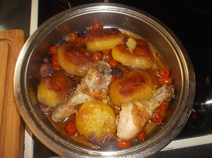 La receta habitual es Pollo con patatas asadas que es muy parecida a esta, aunque esta al ser los muslos de pollo y las patatas más pequeñas necesitara algo menos de cocción.