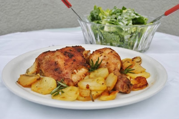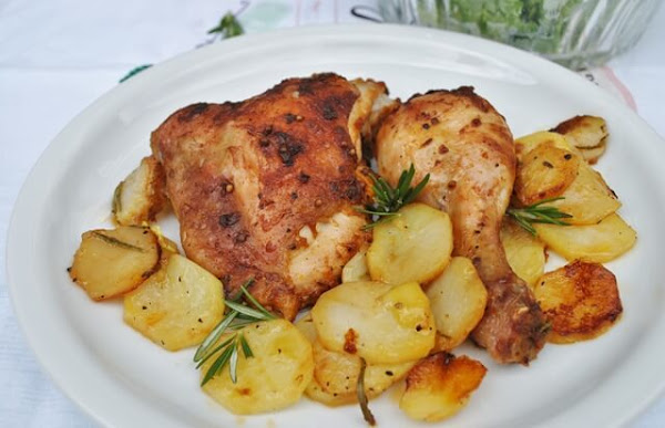 Encender el horno a 200°C calor arriba y abajo. Separar los muslos de los contramuslos del pollo. Pelar las patatas y cortarlas en rodajas de 1,5 – 2 centímetros de grosor. Salpimentarlas y untarlas con aceite y las hojitas de romero. Colocar las patatas en la fuente del horno y colocar el pollo encima, con la piel hacia arriba. Hornear el pollo de 45-60 minutos.