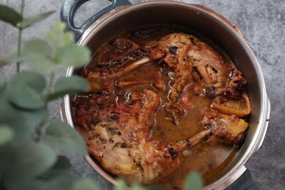 Sólo necesitas una olla exprés, 2 contramuslos de pollo, limón, hierbas aromáticas, aceite y cebolla. Más fácil imposible.