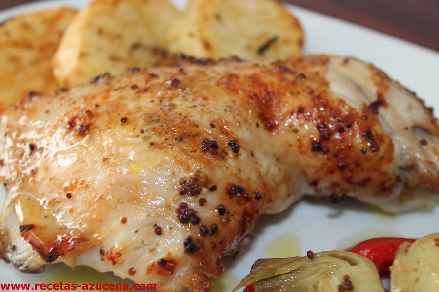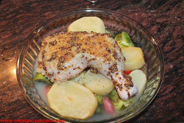 Solo no falta añadir el caldo de pollo y el vino que lo pondremos con cuidado de que lo le caiga a los muslos por encima para que no se lleve los granos de mostaza, metemos la bandeja en el horno y lo dejaremos durante 55 minutos.