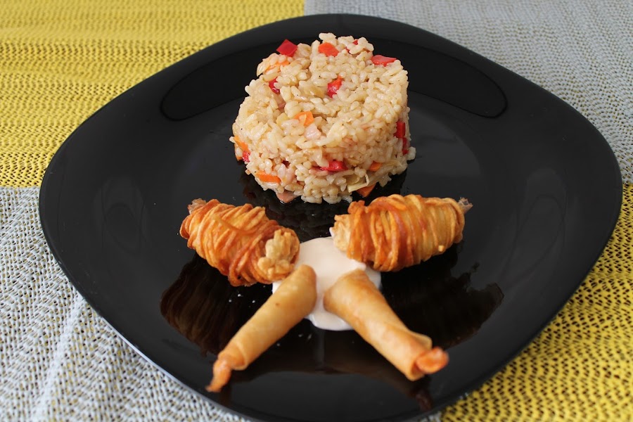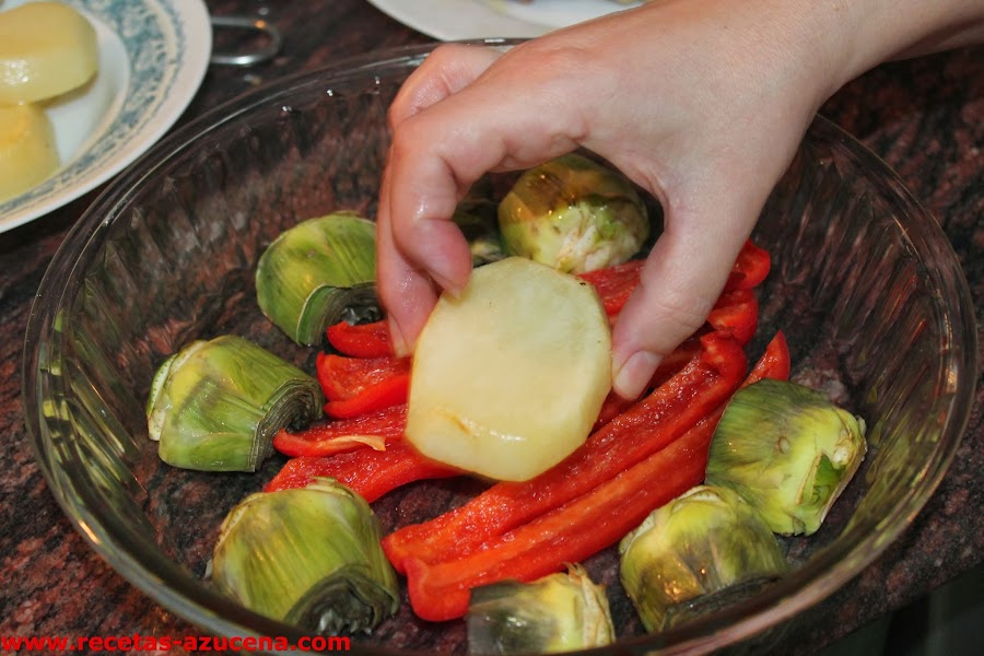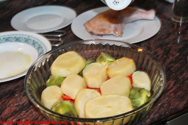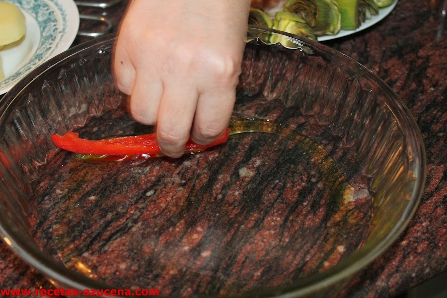 Vamos a preparar una cama para los muslos, lo primero que pondremos serán los pimientos en el centro de la bandeja, por los lados pondremos los corazones de alcachofas, una pizca de sal y ahora pondremos todas las patatas por encima.