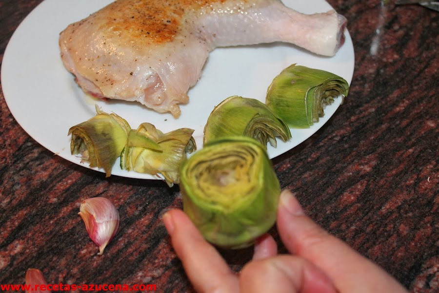 En este momento ya podemos pelar las alcachofas, solo necesitaremos el corazón de cada una, cuando las tengas todas peladas las cortaremos por la mitad.