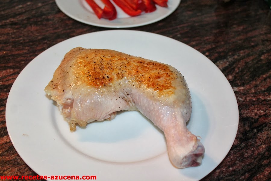 Ponemos una sartén al fuego, a fuego fuerte, cuando este caliente añadiremos dos cucharadas de aceite, salpimentamos los muslos y los ponemos en la sartén 1 minuto por cada lado, lo que queremos es que se dore un poco la piel.